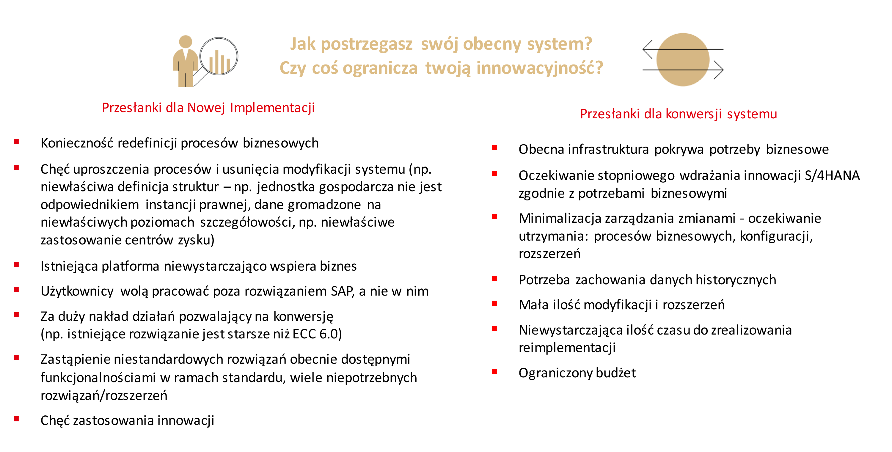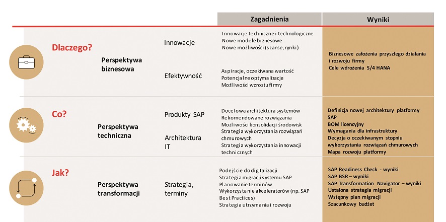 Decyzja o migracji do S/4 HANA jest dla firm ważna decyzja biznesową – wymaga zaangażowania zespołów, poniesienia kosztów przedsięwzięcia. Dla podjęcia optymalnej decyzji konieczne jest przeanalizowanie sytuacji firmy w 3 podstawowych aspektach: