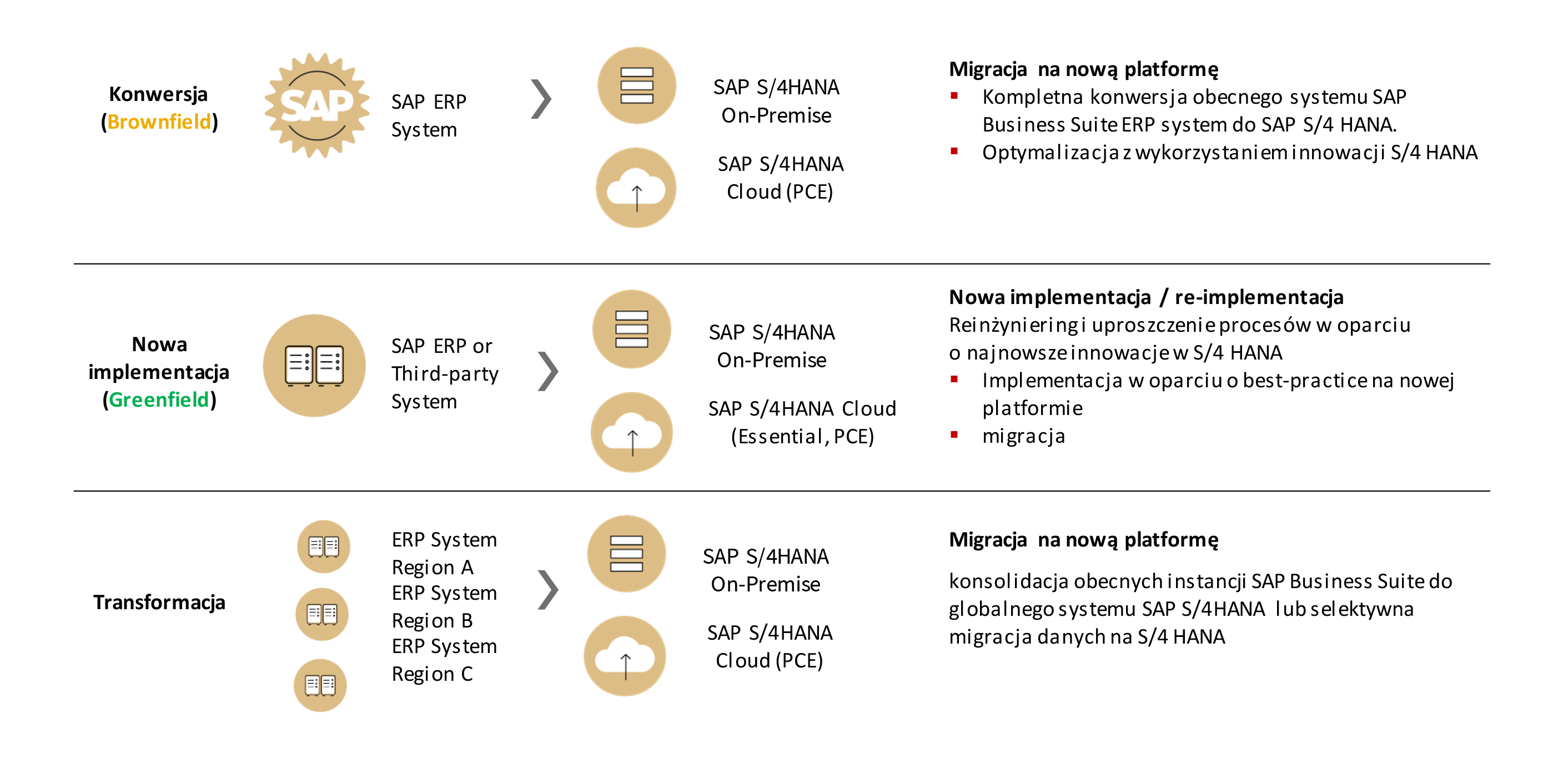 - Wybór oczekiwanej opcji implementacji (onpremis lub cloud prywatny lub publiczy – dla samego systemu SAP ERP oraz dla infrastruktury)